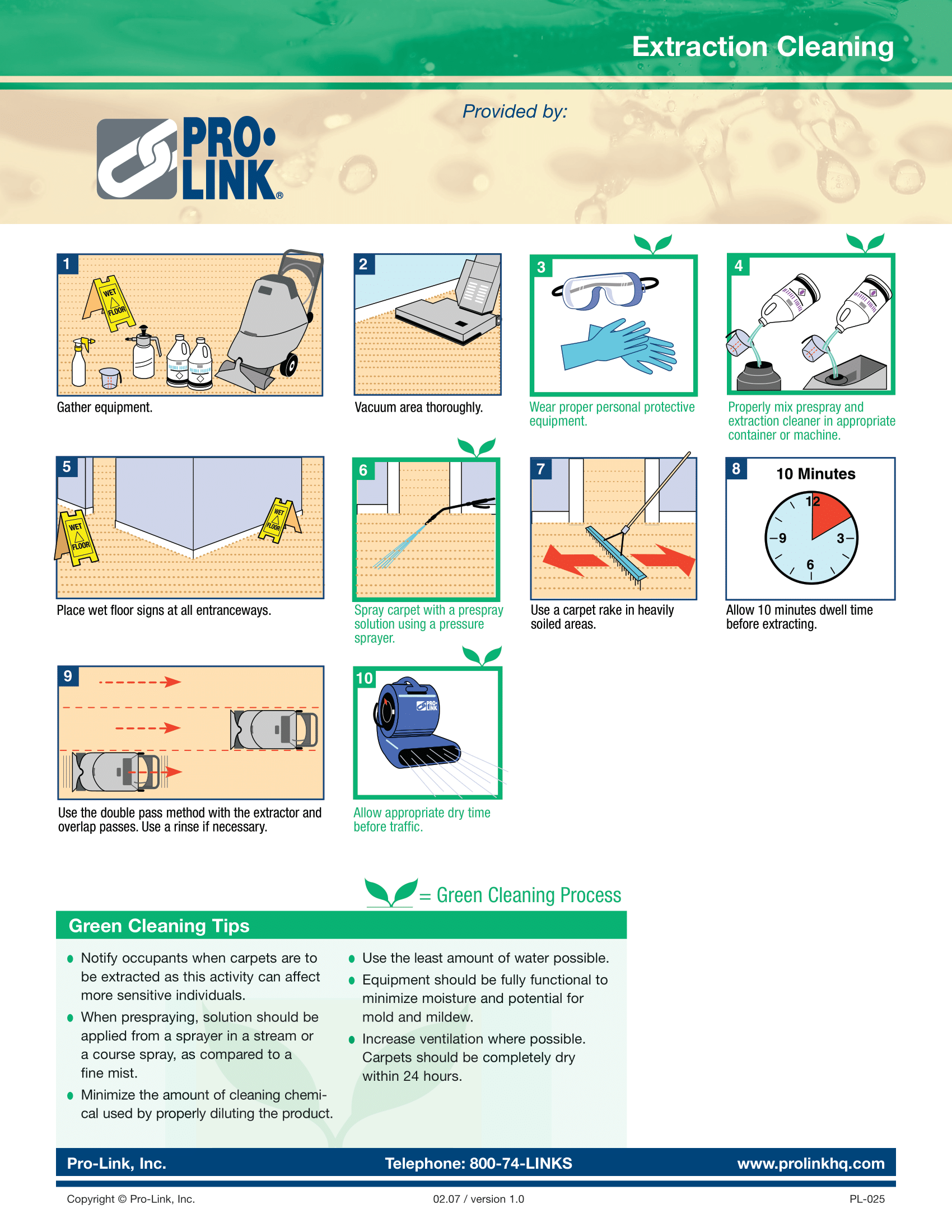 Preparation: Remove all obstructions from the area to be cleaned. If possible, remove the furniture. Vacuum the area prior to cleaning with an extractor. Assemble all the equipment and supplies and take them to the area to be cleaned. Fill solution tanks or portable buckets and add the properly measured extraction solution to the water.