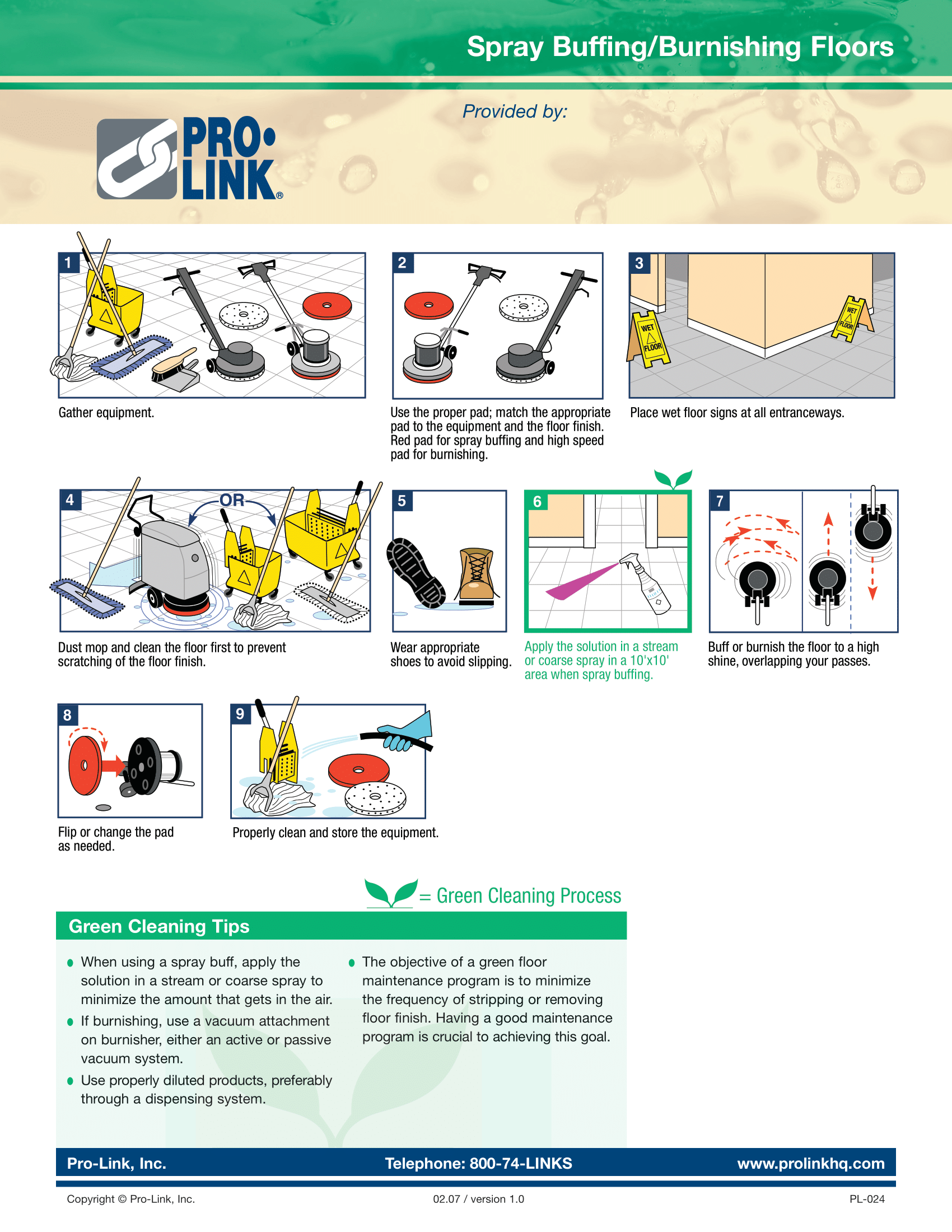 Machine Buff Floor: a) Spray Method – requires a 175-1500 RPM machine. Spray conditioning restorer in a high mist over a sectin of the floor. Immediately buff the sprayed section until the floor is dry. Always overlap two to three inches to provide uniform coverage. Repeat until complete. Polish the floor with a whie pad if so desired. Finally dust mop immediately.