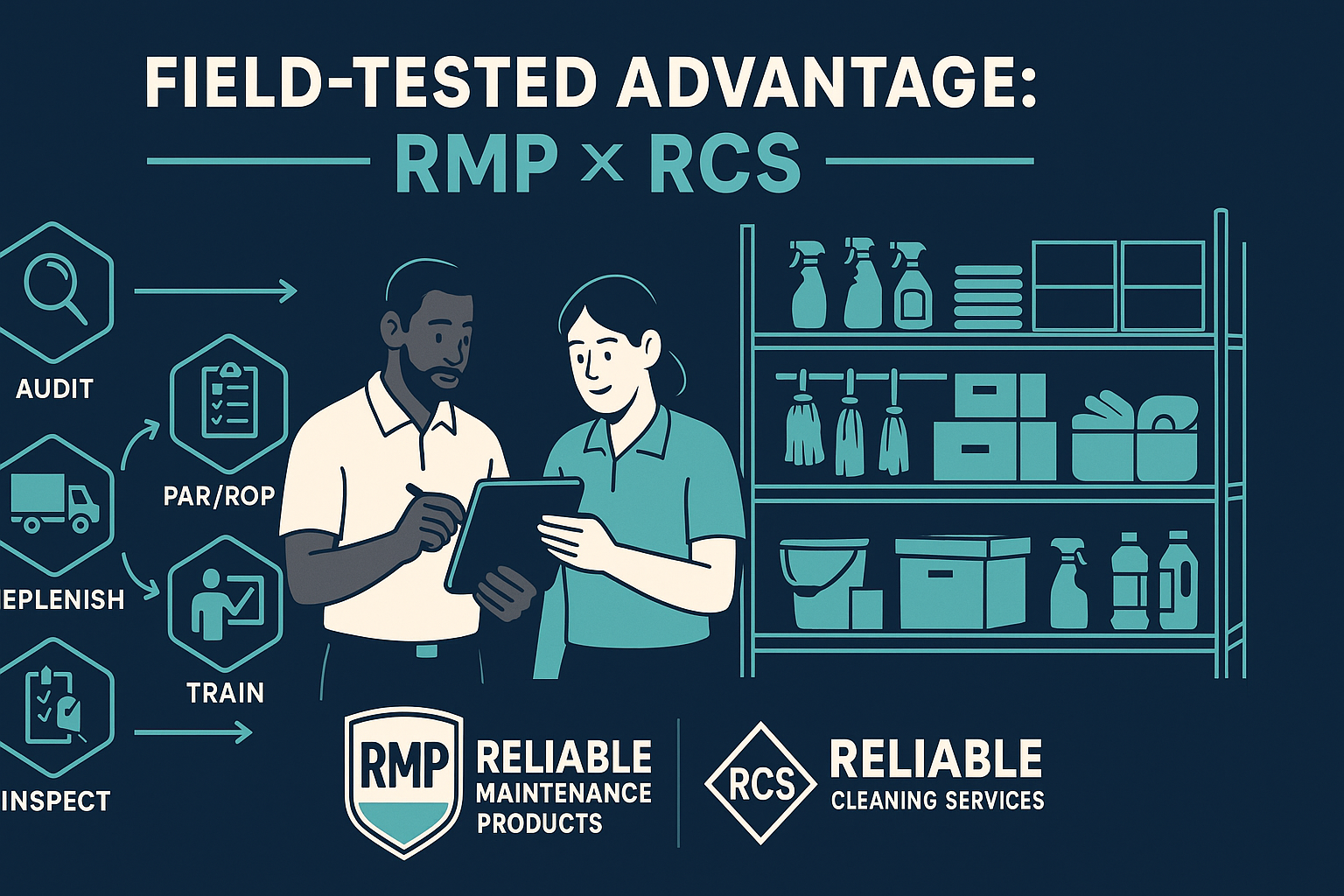 Reliable Maintenance Products (RMP) supplies and standardizes the JanSan program; Reliable Cleaning Services (RCS) uses those same products in the field every day. That closed feedback loop means your inventory plan isn’t built on spec sheets alone, it’s shaped by real performance on real soils and surfaces.