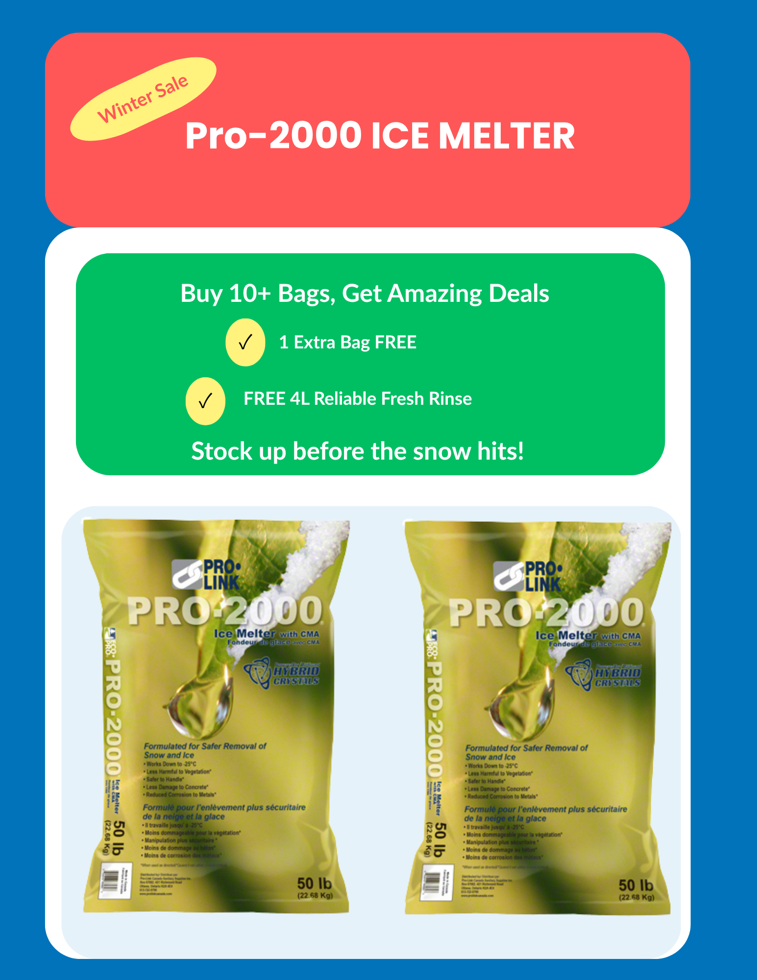 Ready to stock up? ICE MELT PRO-2000 is on sale and available for local delivery or pickup at our locations. Order online at our catalog here. If you prefer standard rock salt, you’ll find it here.