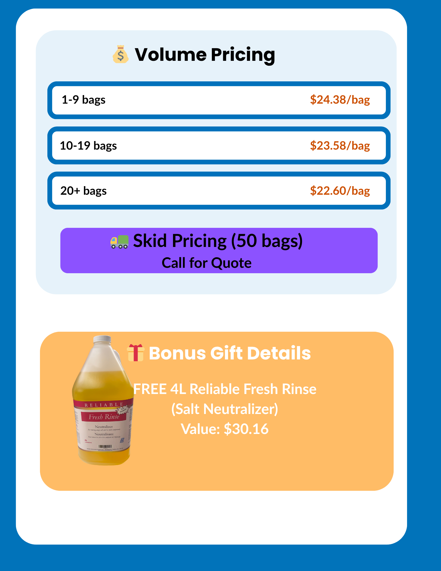 For a limited time, we’re running a Buy-More, Save-More promo. Buy 10+ bags and unlock amazing deals, including 1 extra bag free and a FREE 4L Reliable Fresh Rinse, a salt neutralizer.