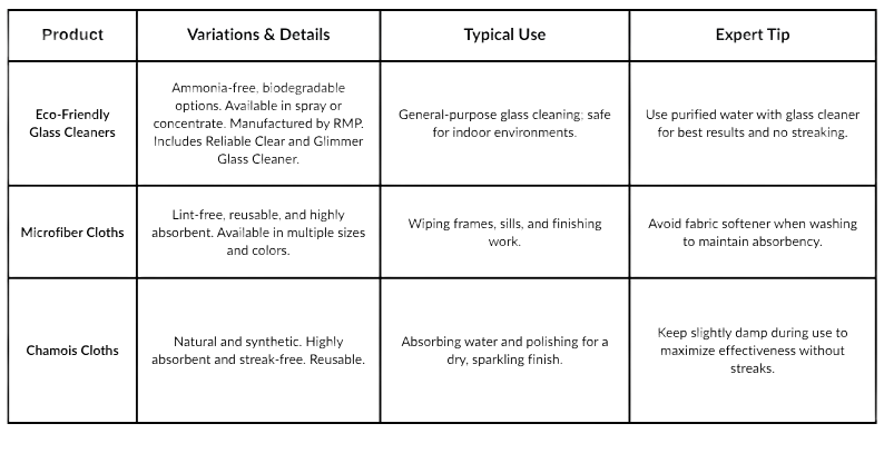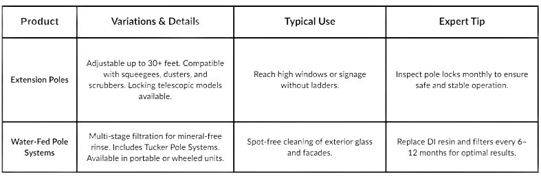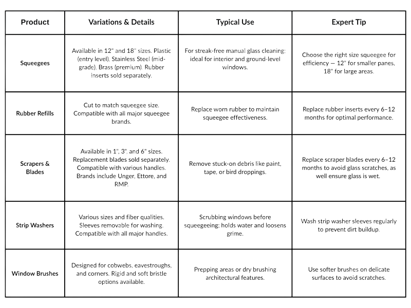 We also offer an extensive range of window cleaning tools and accessories for professionals and DIY users alike. From buckets and strip washers to window brushes and specialty cloths, each product has been field-tested by our own crews to ensure high performance and durability.
